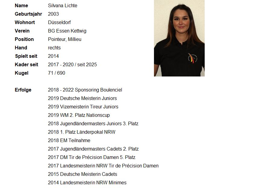 Ob Sil­va­na Lich­te, die Deut­sche Meis­te­rin im Tir de Pré­cis­i­on 2025, eine Pétan­que-Becke­rin ist, weiß ich nicht. Sie könn­te jedoch das Poten­ti­al haben. Aller­dings boo­te­te die Bun­des­trai­ne­rin Lara Koch die frisch gekür­te Meis­te­rin für die anste­hen­de WM mit dem Hin­weis aus, dass sie noch zu jung sei: