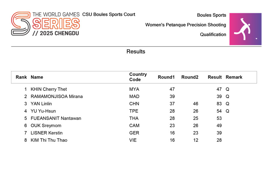 19. Qua­li­fi­ka­ti­ons­tur­nier am 30. März 2025 zu den World Games in Cheng­du, Chi­na: Ergeb­nis­se der Vor­run­de